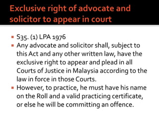 Legal Profession Act An act to provide for the enrolment and practice of legal practitioners for the establishment of a general legal council with functions relating to legal education and the discipline of legal practioners. A qualified person may be admitted as an advocate and solicitor if he fulfils the requirements as set out in. KUALA LUMPUR May 6 The Bar Council has suspended its requirement for all law firms in Peninsular Malaysia to get its approval before using their logos slightly less than two weeks after introducing the new rule.